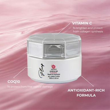 Vitamin C brightens and promotes collagen, Vitamin E protects, and CoQ10 repairs, plumps and hydrates instantly.